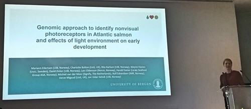 I was given the opportunity to present a poster on work from my PhD at the Institute of Aquaculture, University of Stirling in collaboration with the University of Bergen titled ‘Clock genes and circadian rhythmicity in Atlantic salmon’. In addition, I contributed towards my University of Bergen collaborator Mariann Eilertsen’s, presentation ‘Genomic approach to identify nonvisual photoreceptors in Atlantic salmon and effects of light environment on early development’, in which published salmonid reference genomes have been fundamental to our work. This has enabled us to start exploring the effects of narrow bandwidth LED light on photoreception, clock gene expression and circadian rhythmicity in early developmental Atlantic salmon.